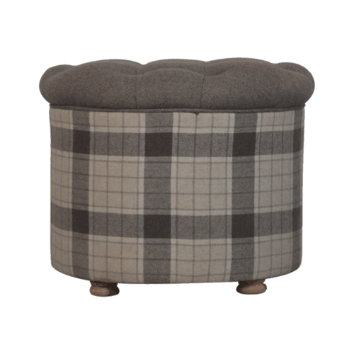 This little round stool with oak-ish feet has been upholstered in brown tartan fabric with a brown tweed top featuring a deep button design and can be used as an occasional seat in any setting. You may encounter variations from batch to batch hence if you are looking to pair products under similar room settings; you can opt for a bespoke order or take an informed decision about the possible variations.