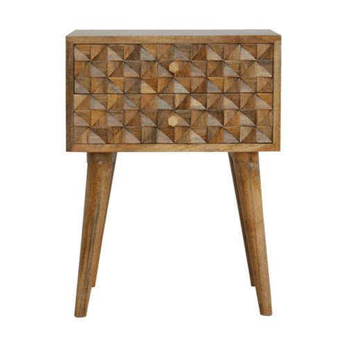 The main feature of this nightstand is the hand carved cube drawer fronts which make the pieces from this collection stand out. It has been constructed from 100% solid mango wood in an oak-ish finish and stands on 4 Nordic style legs. It can be partnered with the other pieces from the range or stand individually as its style is versatile and can fit into different types of interiors.