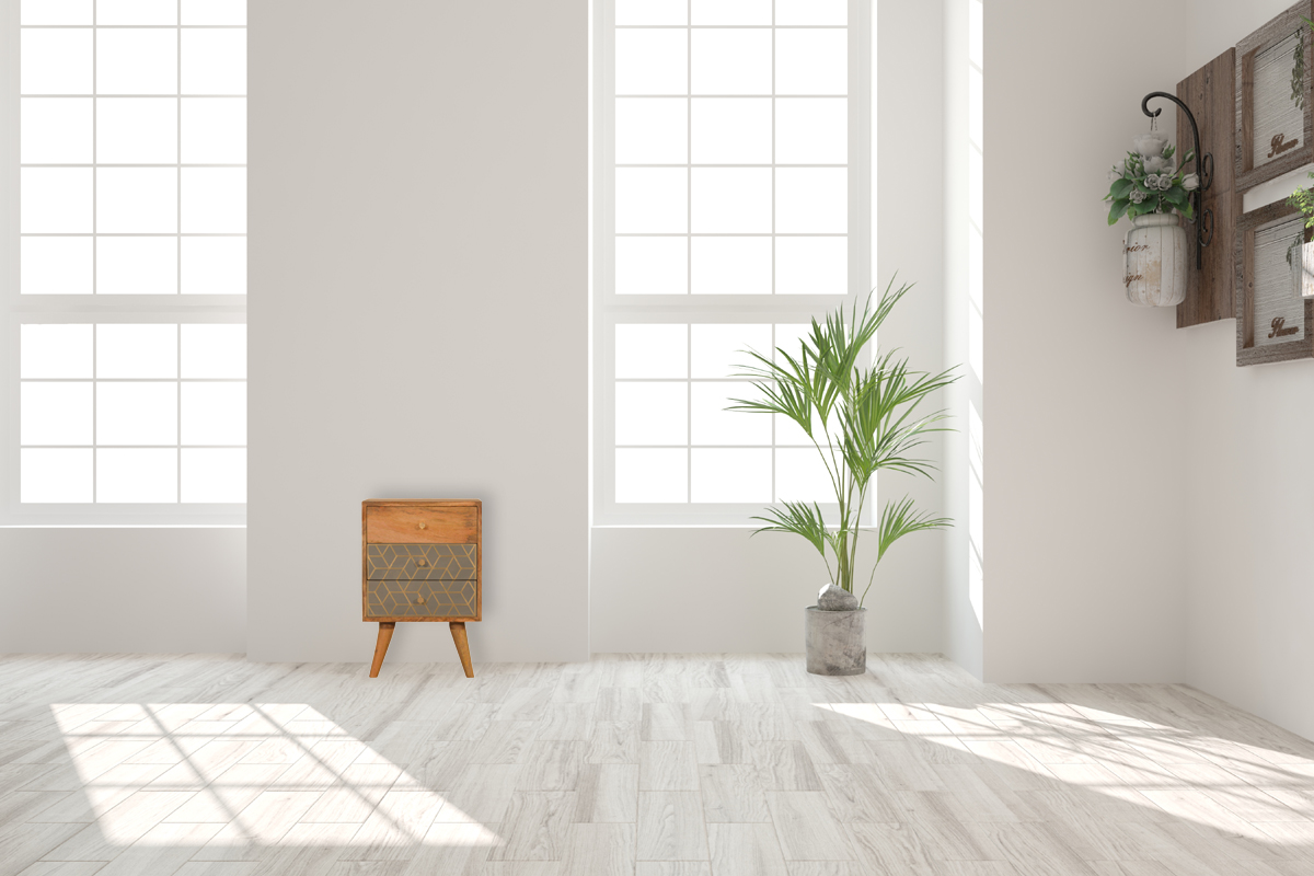 This nightstand has been inspired by a clean and modern design. It has been constructed from 100% solid mango wood in an oak-ish finish and features 2 gold dice patterned drawers which blend beautifully with the grain pattern of the wood. Other features include nordic style legs and shiny brass knobs.