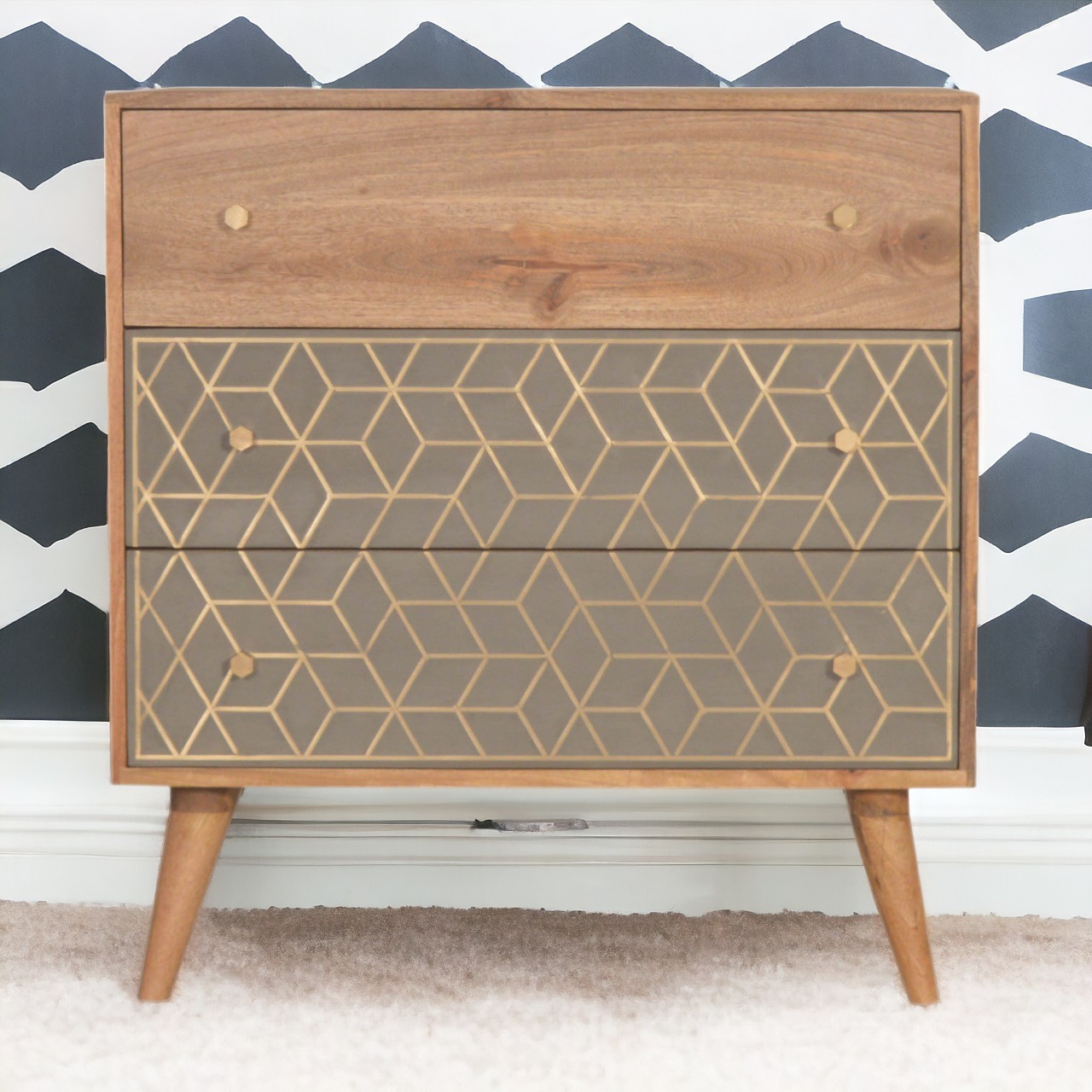 This chest has been inspired by a clean and modern design. It has been constructed from 100% solid mango wood in an oak-ish finish and features 1 oak-ish and 2 gold brass cement dice patterned drawers that blend beautifully with the grain pattern of the wood. Other features include nordic-style legs and shiny knobs.