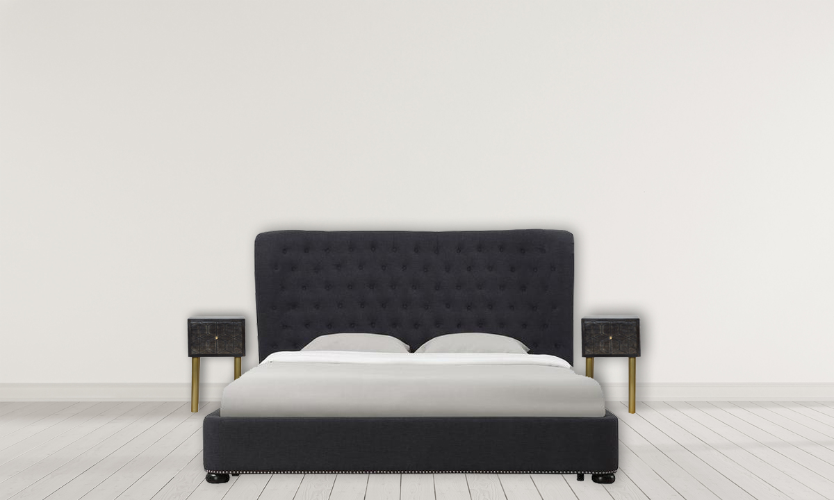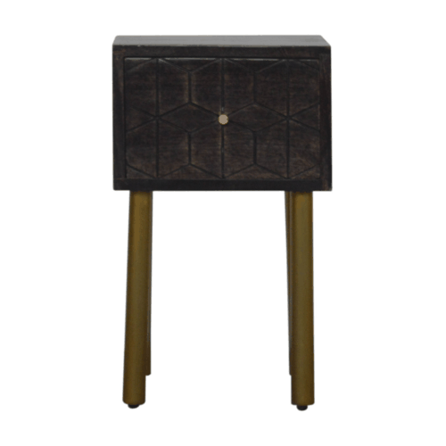 This luxurious nightstand has been constructed from 100% solid mango wood in a washed black finish and carved design. It has a neat design on the drawer front and a carefully placed knob in the middle which matches up perfectly with the straight brass legs.
