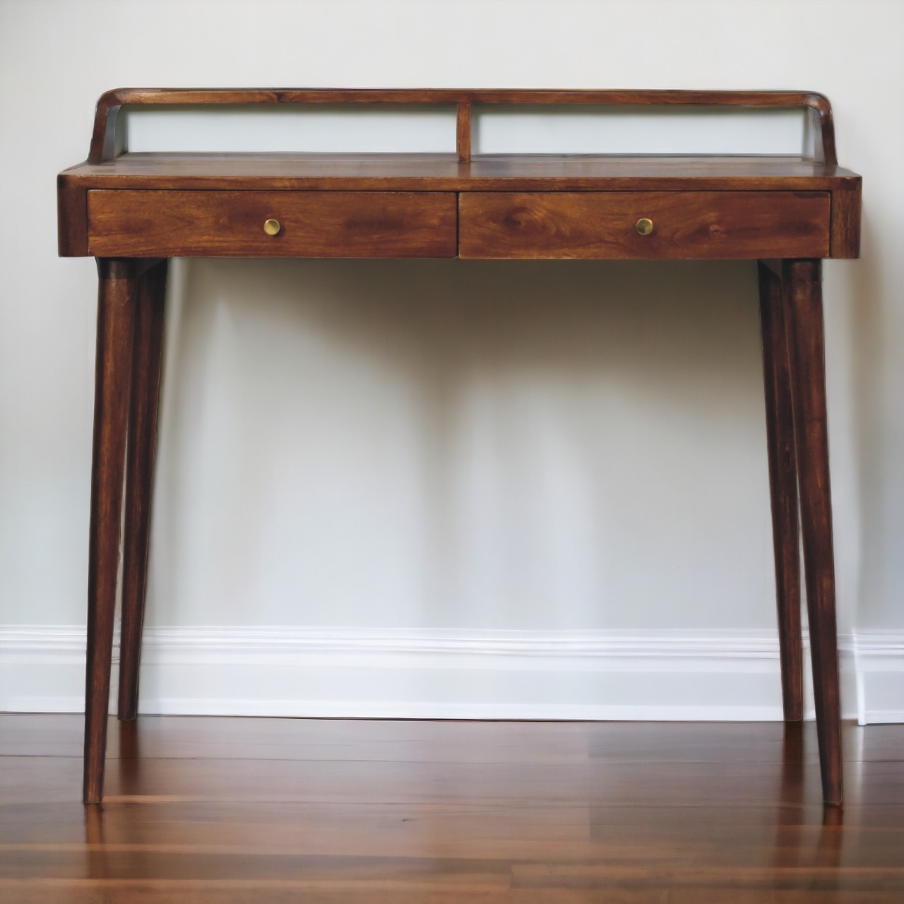 This console table is masterfully crafted from 100% solid mango wood with a rich chestnut finish that highlights the natural beauty of the wood grain. It features a unique design with a slightly raised back, adding an elevated aesthetic that enhances any entryway or living space. Supported by Nordic-style legs, and 2 handy drawers perfect for storing everyday items. The table presents a overall modern and minimalist look.