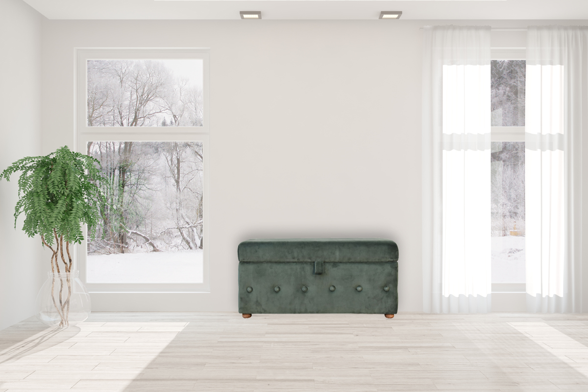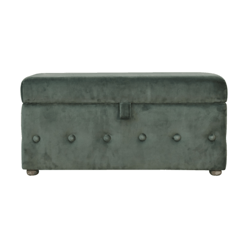 Make home storage effortlessly easy and elegant with this ottoman. Upholstered in a beautiful emerald cotton velvet fabric. There is lots of room inside for plenty of storage as well as a deep button design giving it a chic look. It is finished with four solid wood feet for balance. A discreet way to keep your home clean and tidy._x000D_
