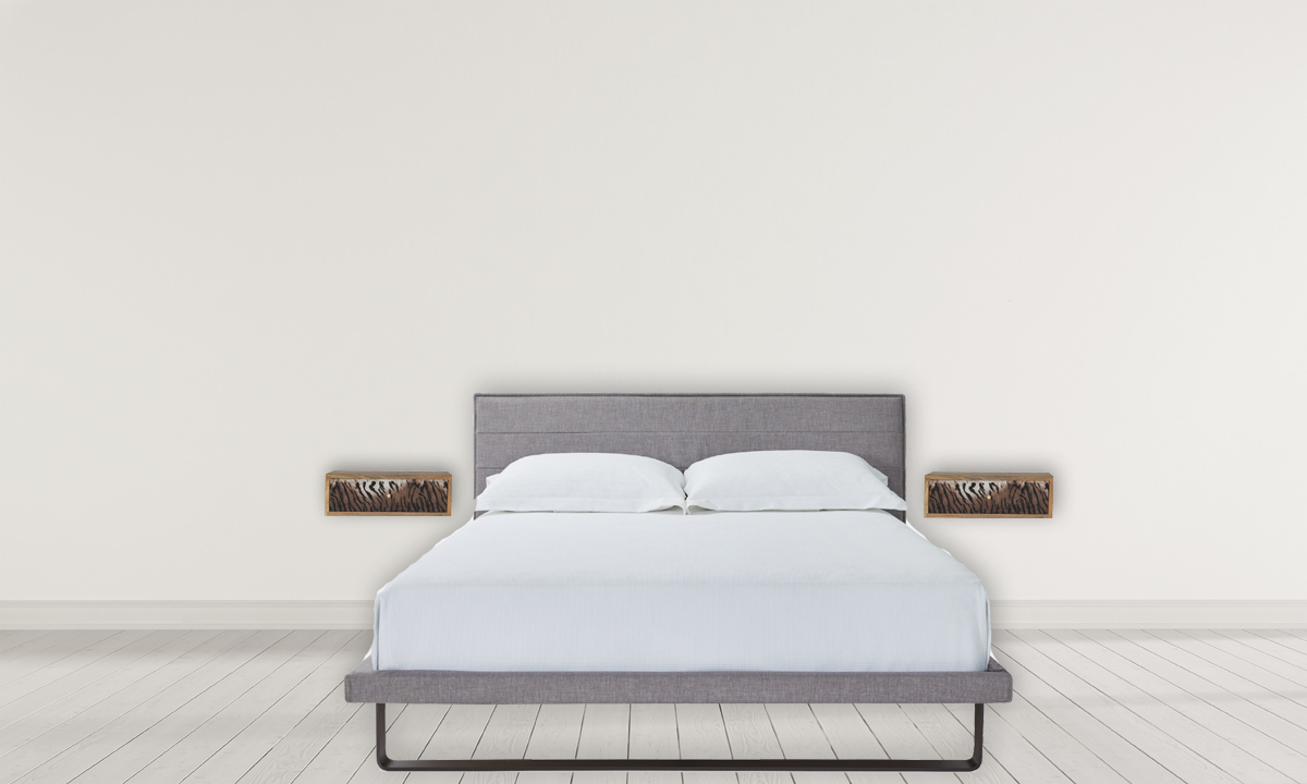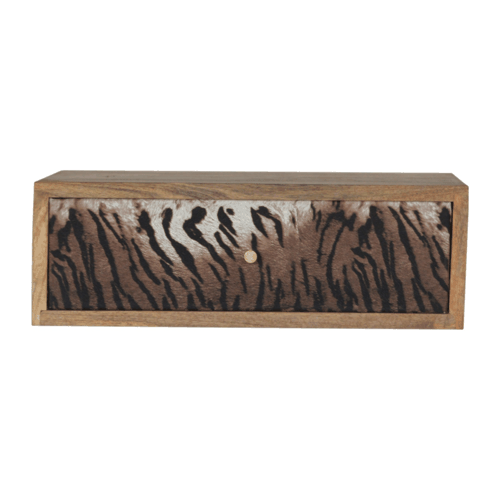 Introducing Animal Print. This wall-mounted nightstand will take your bedroom to another level. Constructed from 100% solid mango wood in a fine oak-ish finish, the main feature being the drawer has a beautiful tiger animal print drawer finished with a shiny knob giving the whole piece extra character.
