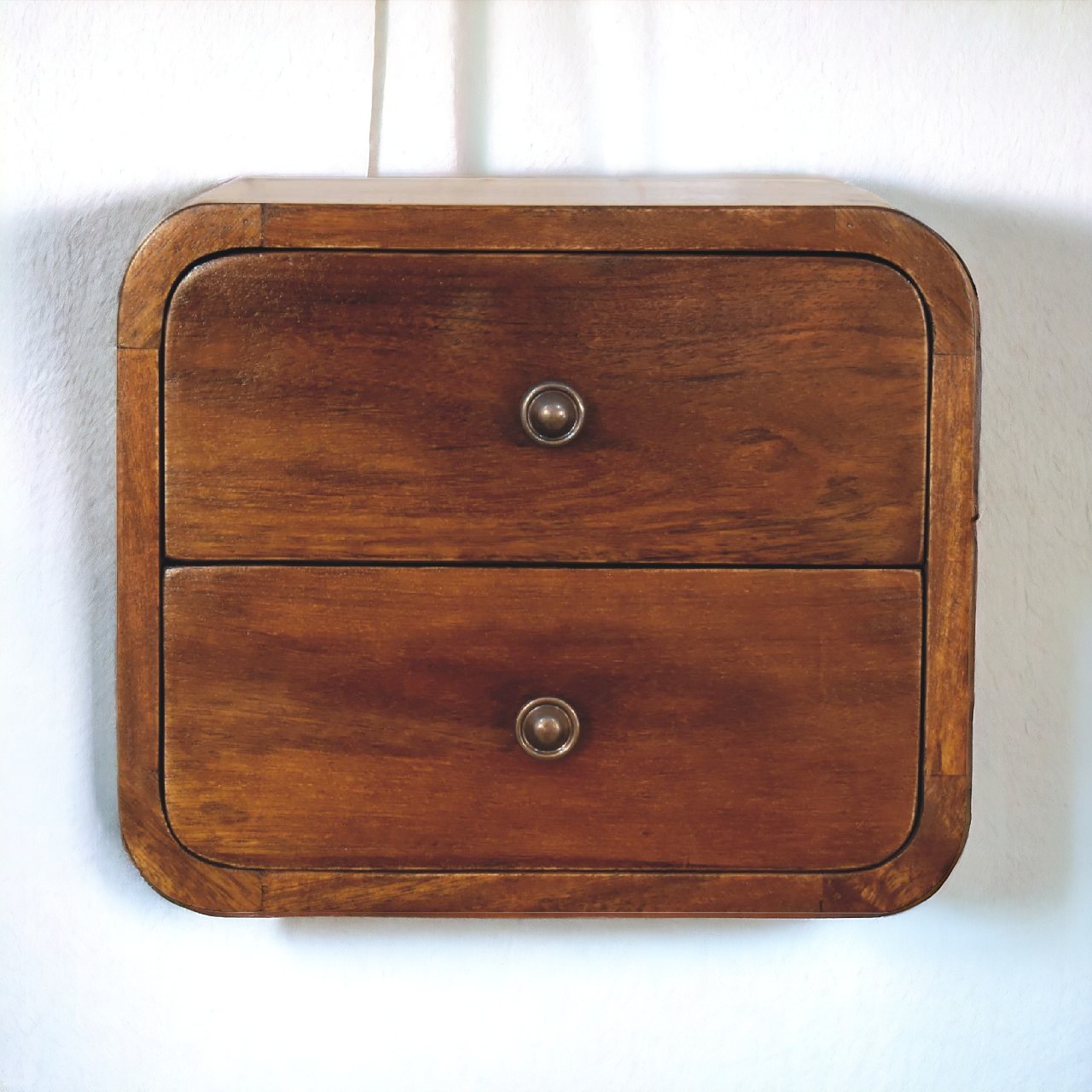 Inspired by our curved range, this minimalistic mini wall-mounted unit has been constructed from 100% solid mango wood in a chestnut finish and features 2 drawers that feature shiny knobs. This piece is perfect for storing any bits and pieces you wish to keep close by before bedtime. Its neat and clean design can easily be mounted on the wall without the fuss of any legs. Caution! Do not sit on the unit. This petite product is part of Recession Collection._x005F_x000D__x000D_