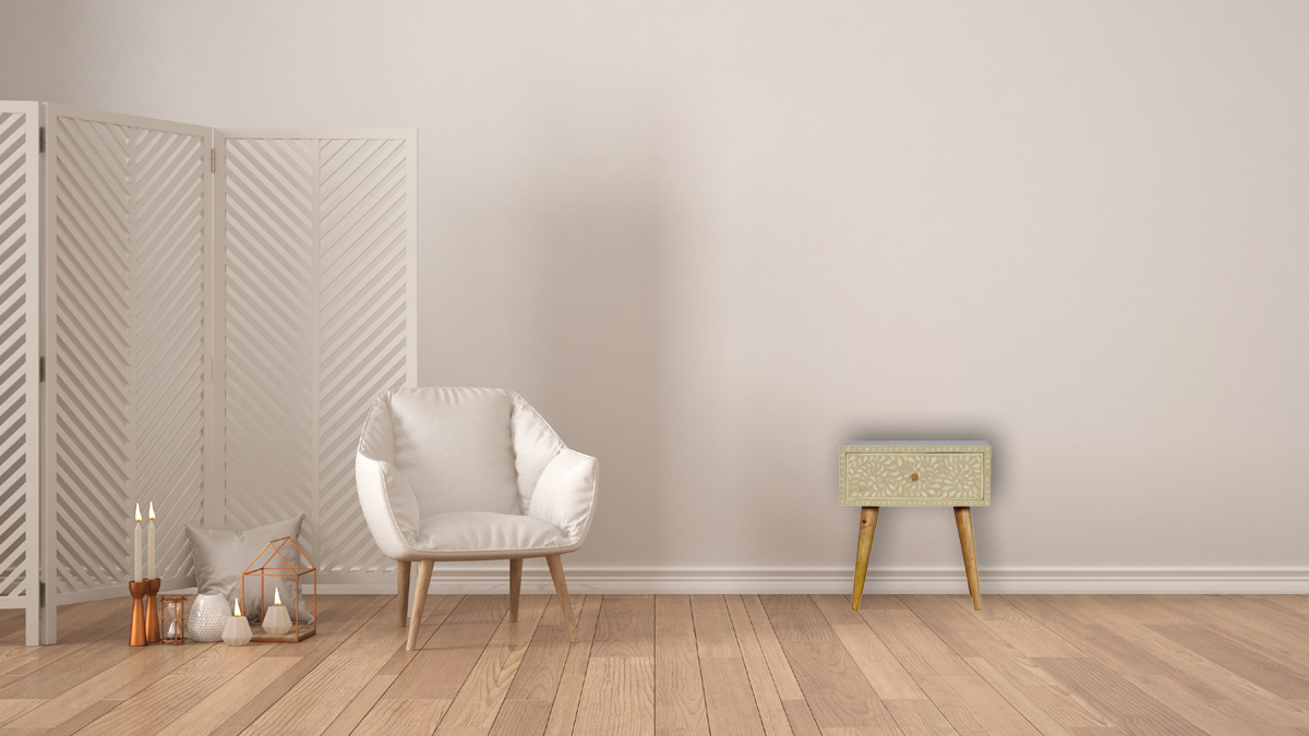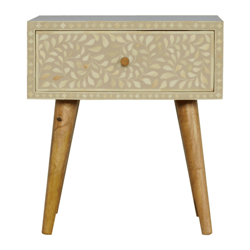 This nightstand table has been constructed from 100% solid mango wood features a drawer decorated with a floral bone inlay design and has been delicately painted in a grey colour with an Oak ish finish base and Nordic style legs. It has 1 spacious drawer for keeping any easy-to-reach bits and pieces and can either be partnered with the other pieces from the range or can look good as a standalone piece partnered with another nightstand.