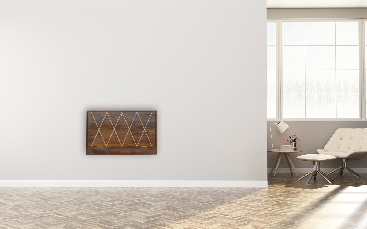Inspired by vintage design, this solid wood flip-down writing desk provides ample space for you to work on. It is a wall mounted piece, perfect for storage saving solutions. It is constructed from 100% solid mango wood and has a fine chestnut finish. Other features include 1 large shelf and 2 smaller shelves perfect for working and studying. The gold brass inlay detail brings the whole piece together.