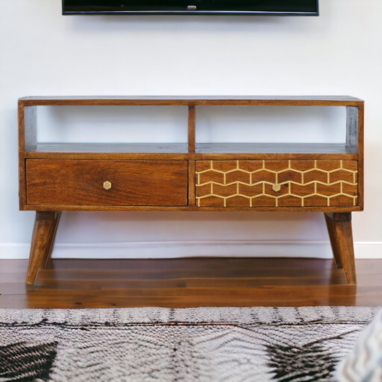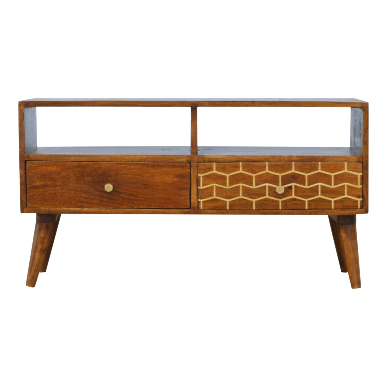 Add this media unit to your living room, or bedroom. Standing on 4 Nordic style legs it features 2 open slots and 2 drawers which each have 1 shiny brass knob. This is a very stylish and versatile piece that features a gold brass patterned drawer front. This piece can stand alone or can be completed with the matching collection.