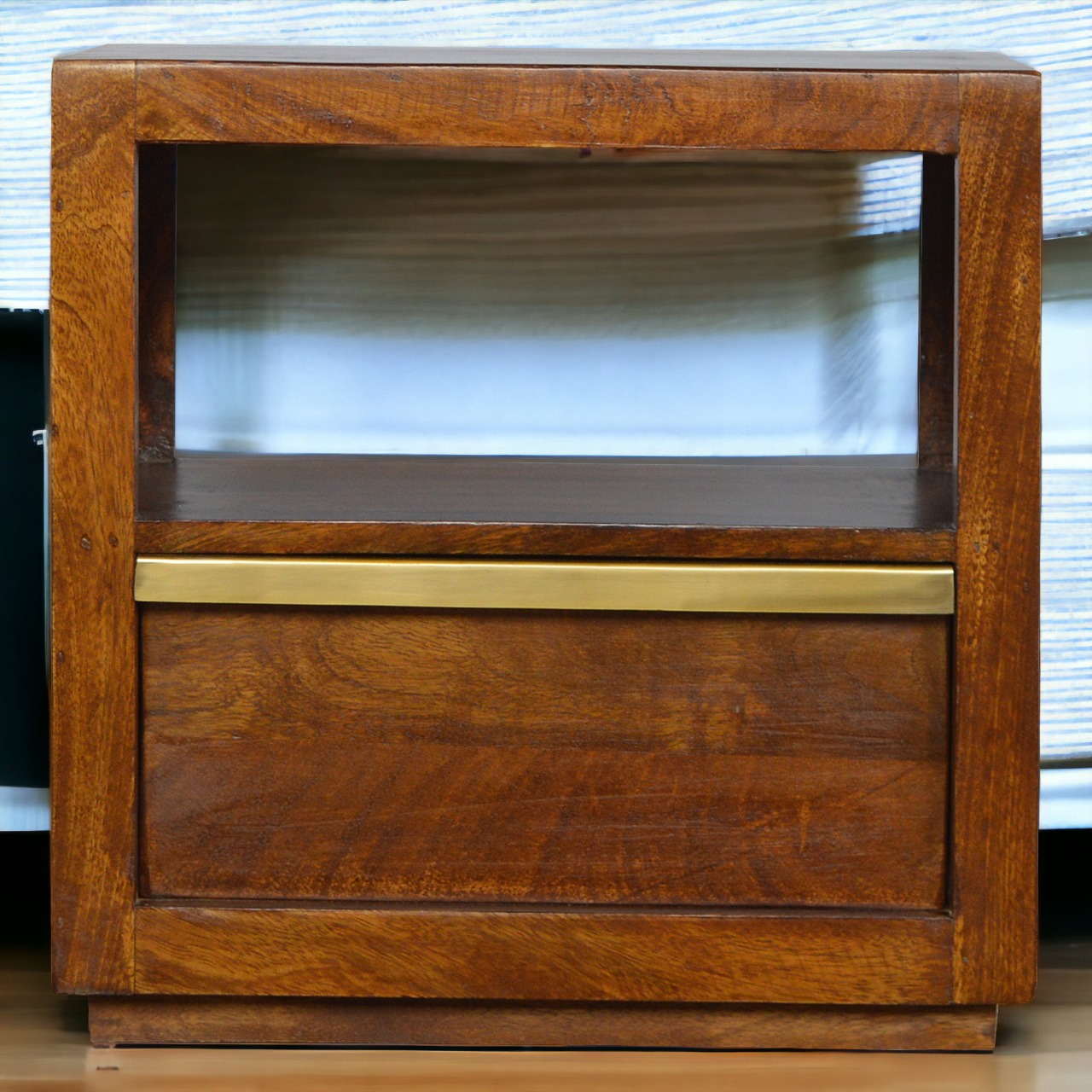 Add this nightstand table to your bedroom, featuring a clean-cut design with 1 open slot, 1 pull-out drawer with a golden brass bar handle. The piece can stand alone beautifully or be partnered with the other pieces from the range. It has been constructed from 100% solid mango wood and has been finished in a rich chestnut colour, giving the piece a nice contrast between the gold metal and wood. The perfect addition to modern homes and compact city apartments.