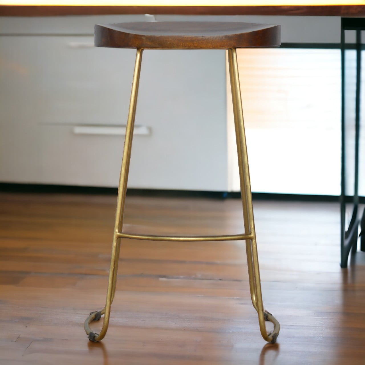 This stool is the perfect addition to any bar/cafe. It is very sturdy yet light enough to move around easily ideal for families that want to use their kitchen as a more social dining/breakfast area. This piece of furniture has nice smooth chestnut finish constructed from 100% solid mango wood with a beautiful golden iron base and legs.