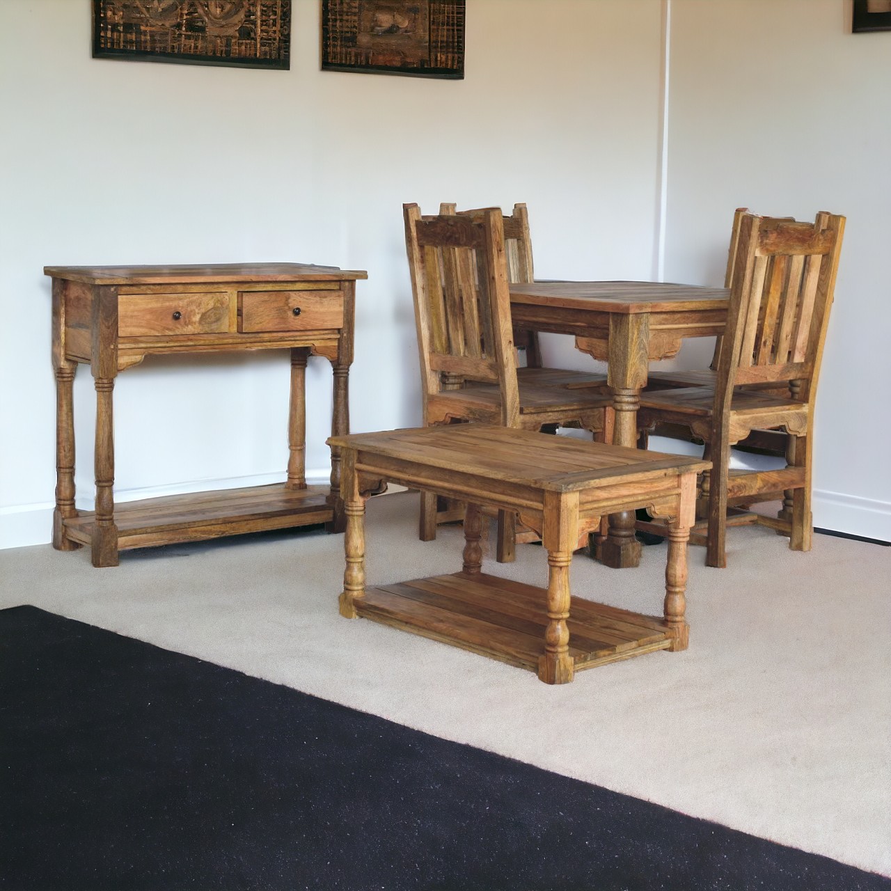 Indulge in dinners with family and friends around this robust table, which has been constructed from 100% solid mango wood in a distressed oak-ish finish. The set comes with 4 sturdy chairs that have a ladder back, turned front legs, and a undercarriage for extra comfort. A beautiful example of a classic English home set.