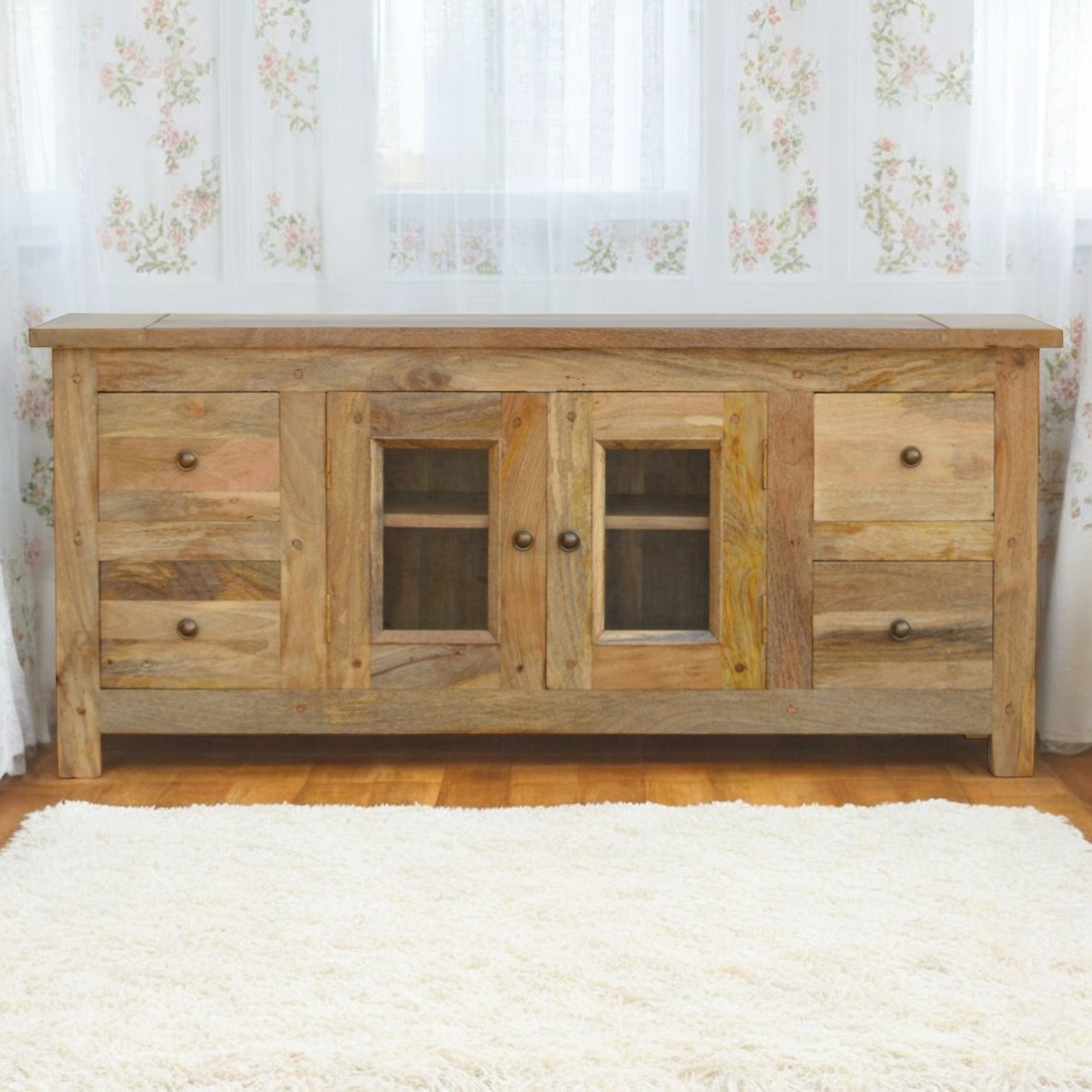 Our solid timber media unit is expertly constructed from 100% solid mango wood, and has fine hand distressed oak-ish finish and simple design to suit most homes. This piece features carefully farm house feet, and handles to the four drawers and two glazed doors that has a shelf placed inside.