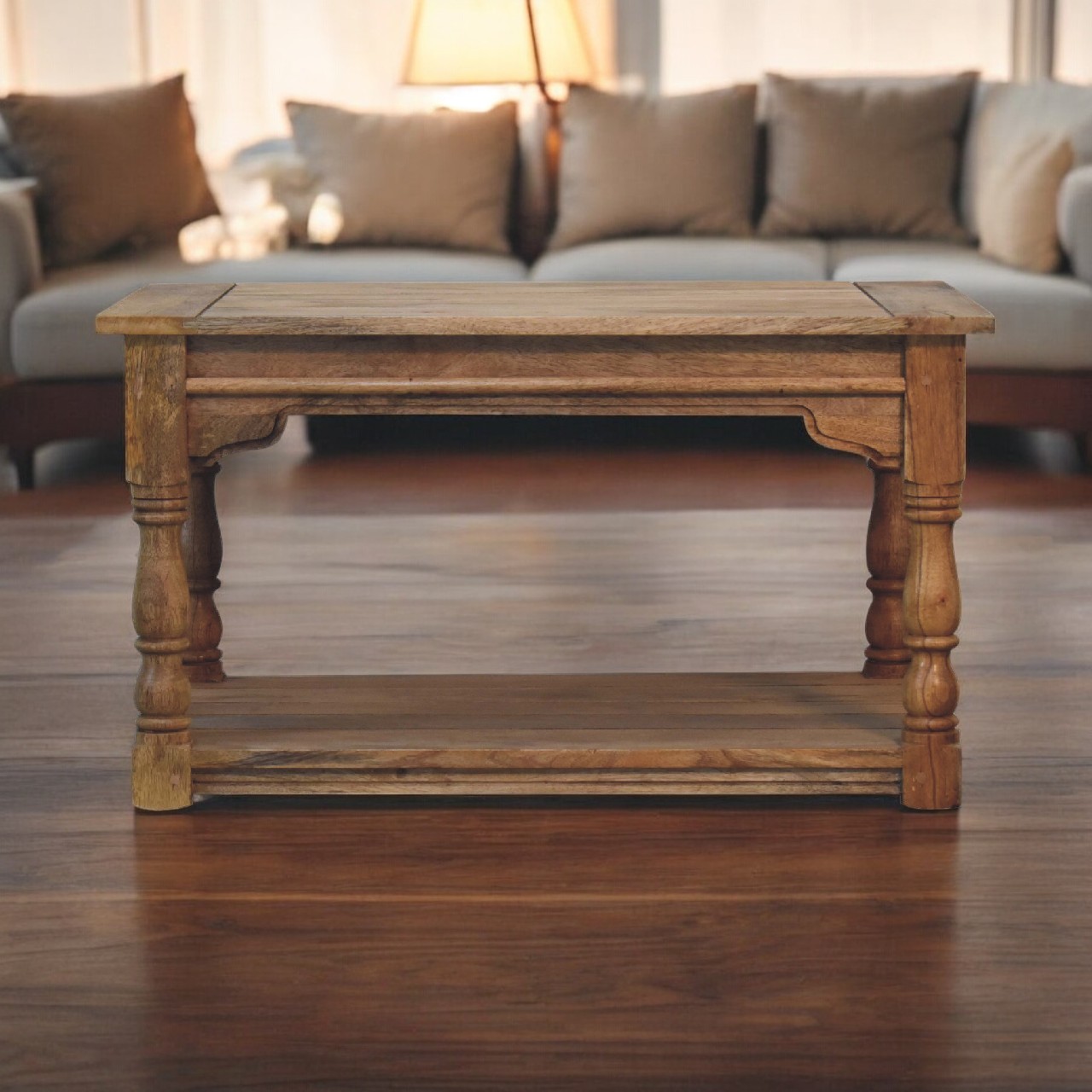 This coffee table features a hand-distressed oak-like finish with grooves and wooden pegs. Made from 100% solid mango wood, this piece is built to last. It includes an under-shelf for additional storage and hand-turned legs, offering an appealing rustic, country-style design. Dimensions: 80 x 50 x 45 cm.