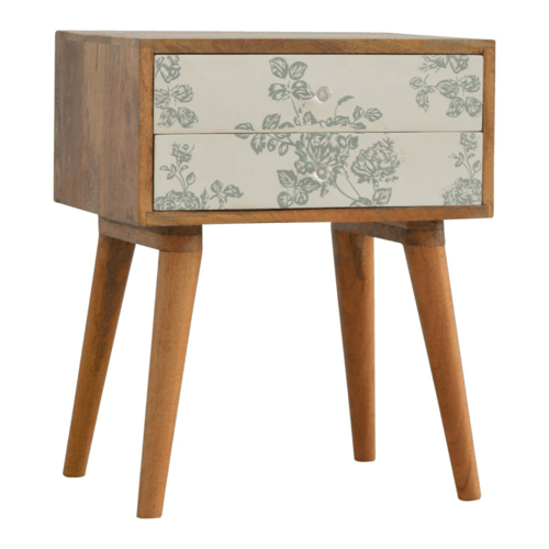 This nightstand table is a versatile piece that will prove handy all over your home and provide storage for any bits and pieces before bed. It has been made from 100% solid mango wood with has a fine oak-ish finish. It also comes with 2 green floral screen printed drawers that have glass knobs and 4 Nordic style legs.