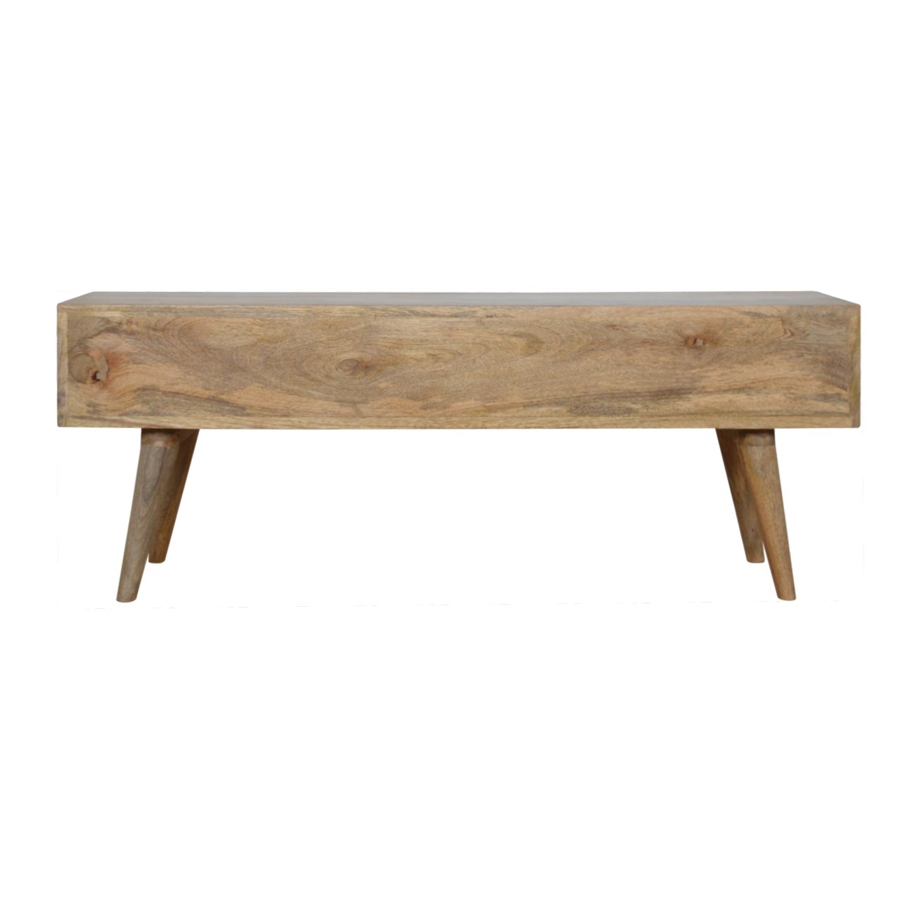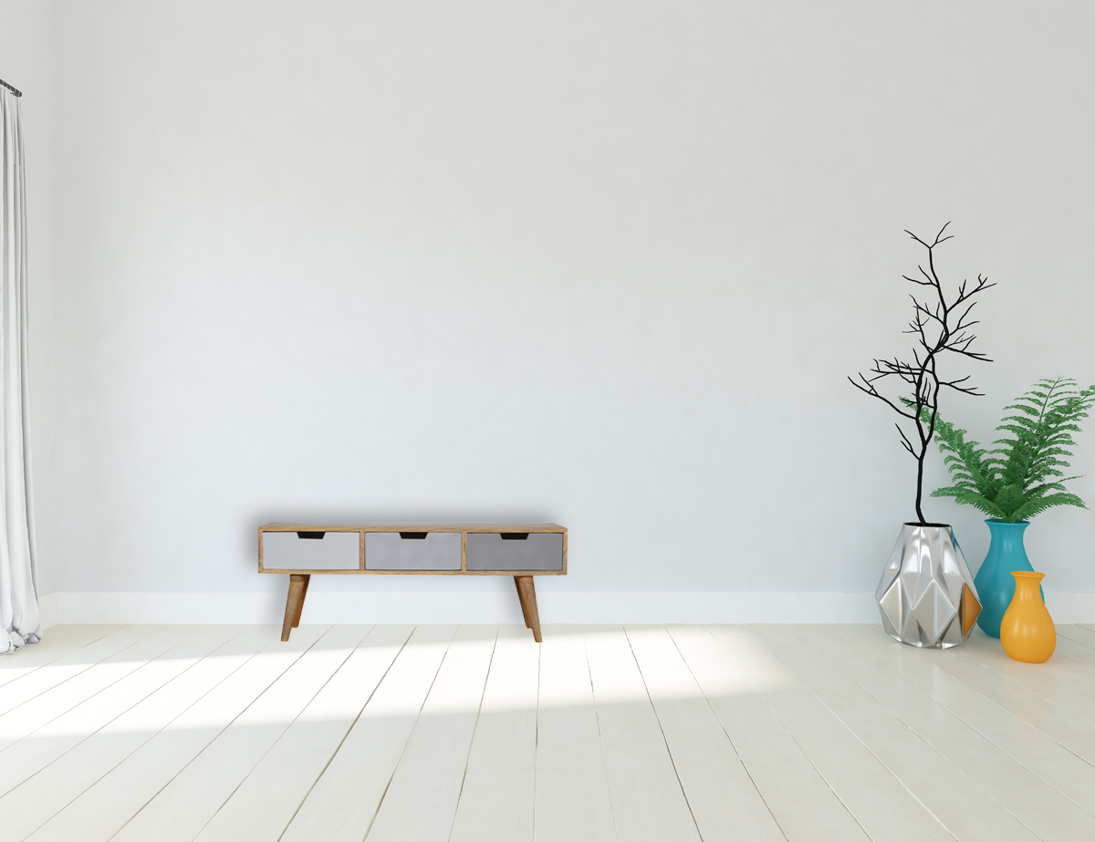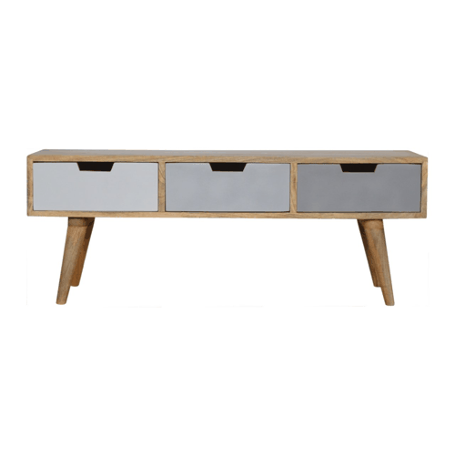 This solid timber media unit is expertly constructed from 100% solid mango wood in an oak ish finish. Has a clean and simple design to suit most homes. It features drawers that are hand spray painted in 3 different tones of grey, some other features include 4 Nordic style feet and a decent-sized table top to place a TV.