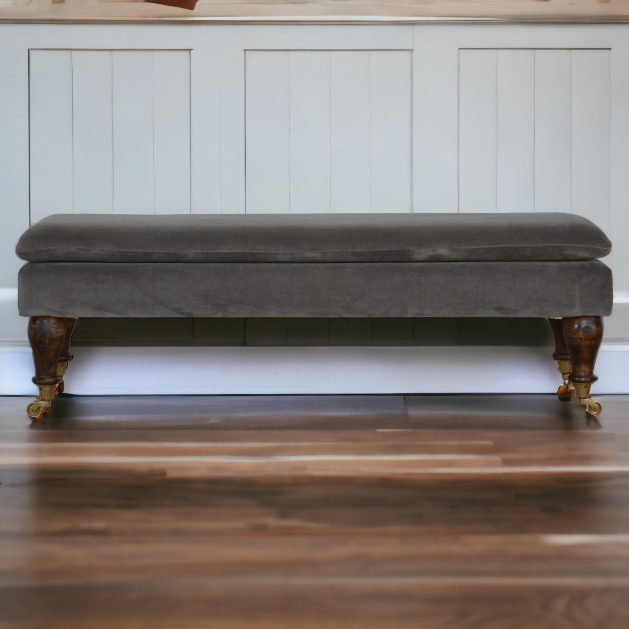 This bench is a great addition to the home. It has been upholstered in a beautiful grey cotton velvet fabric in a light walnut finish and has castor feet to allow easy movement of the bench around the home. A lovely and elegant piece for a bedroom, hallway, or living room. Please note this is NOT a storage bench.