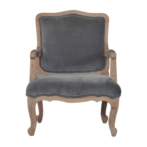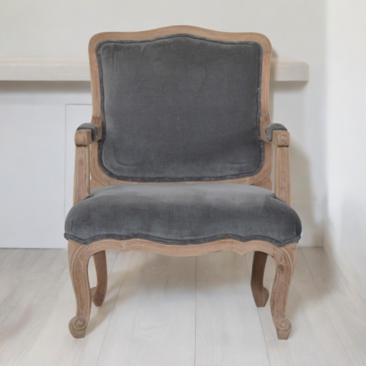 This elegant chair has been upholstered in a grey cotton velvet fabric. It features carved French style cabriole legs constructed from 100% solid mango wood in a sunbleach finish providing strength and durability. This simple yet classy piece can be incorporated in different home settings and interiors.