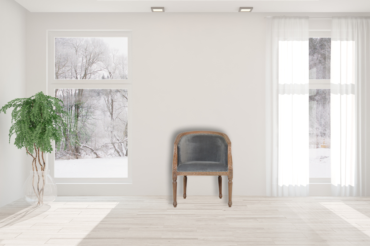 This classy occasional chair has been upholstered in a grey velvet fabric. It features a studded design and legs constructed from 100% solid mango wood providing strength and durability. This simple yet classy piece can be incorporated in different home settings and interiors.