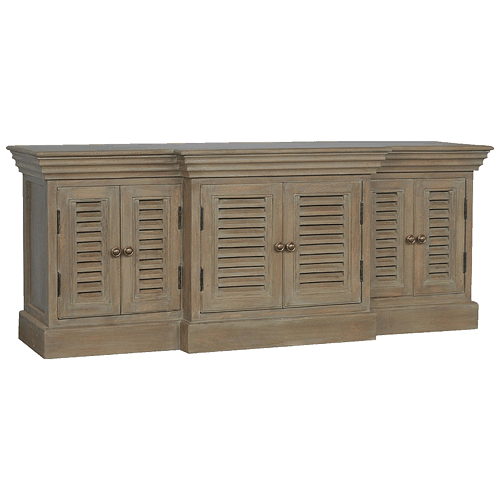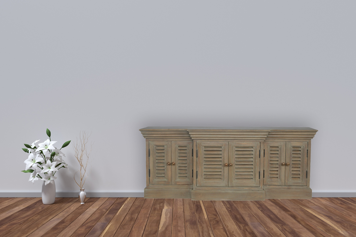 The TV Unit has been made from 100% Mango Wood and finished in a grey wash bleached finish is the epitome of coastal elegance. It comes with 6 French inspired shutters cabinet doors that have round knob handles. A few other features include a decent sized top to place your TV, also this media unit is floor mounted.
