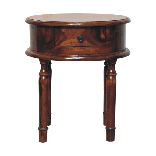 This 1 Drawer nightstand is suitable for a bedroom setting as an ideal place to store small items you wish to keep close before bedtime and to provide ultimate convenience. It is constructed from 100% solid sheesham wood and has a lovely honey finish. Other features include beautifully hand-turned legs and a round shiny knob for the drawer.