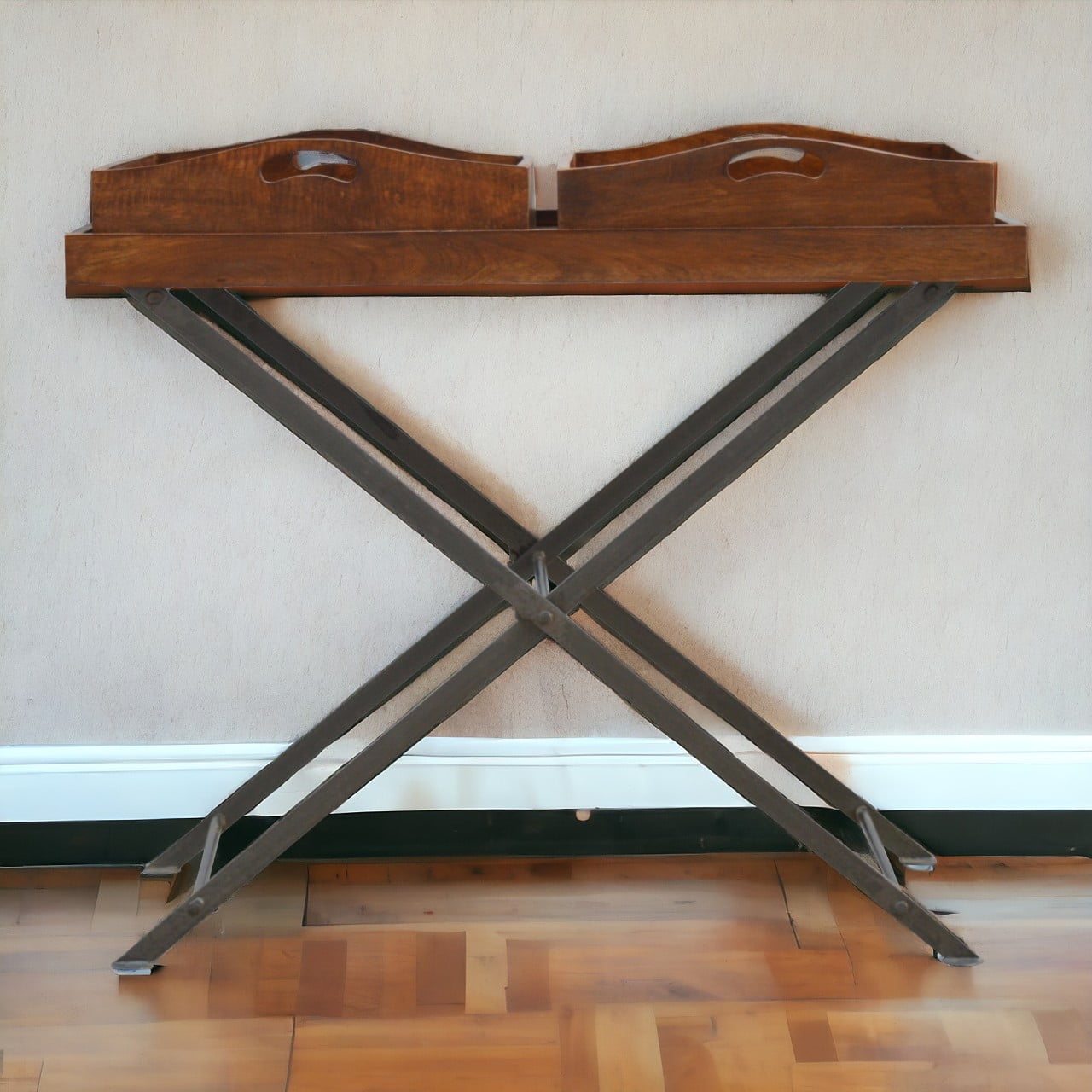 Add this versatile piece to your kitchen which offers ample space with 2 wooden trays for plates, cutlery and food you may want to chop up and prepare. It has been constructed from 100% solid mango wood in a chestnut finish and features a cross metal base with 2 iron legs which makes it strong and sturdy and allows this piece to be stored away easily when not in use. The perfect addition to a cafe/restaurant or kitchen.