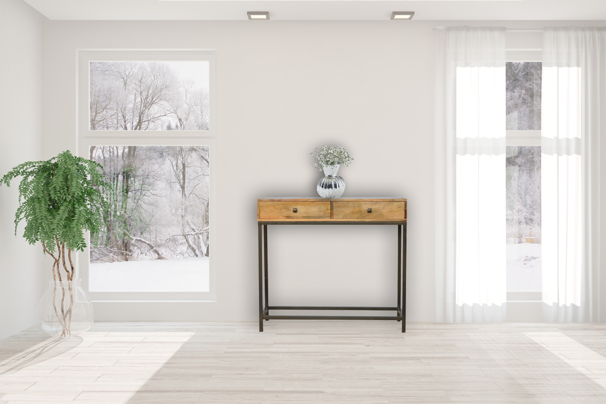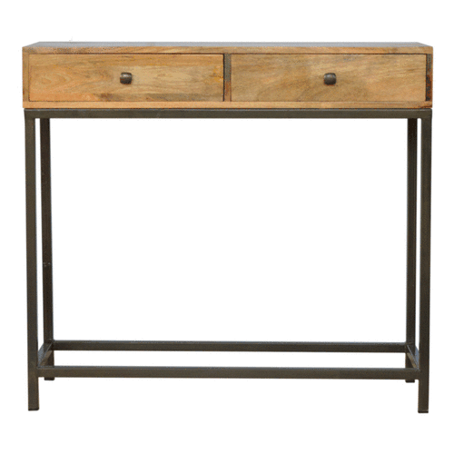 This 2 drawer console table is an excellent choice for adding extra surface and storage space to your hallway. The slimmer design makes this an ideal piece for tighter spaces such as your hallway. The top and drawers are constructed from 100% solid mango wood, and the base/legs is constructed from 100% metal Iron. Other features include straight legs, round shiny knob handles, smooth oak-ish finish on the wood and a pewter finish on the Iron.