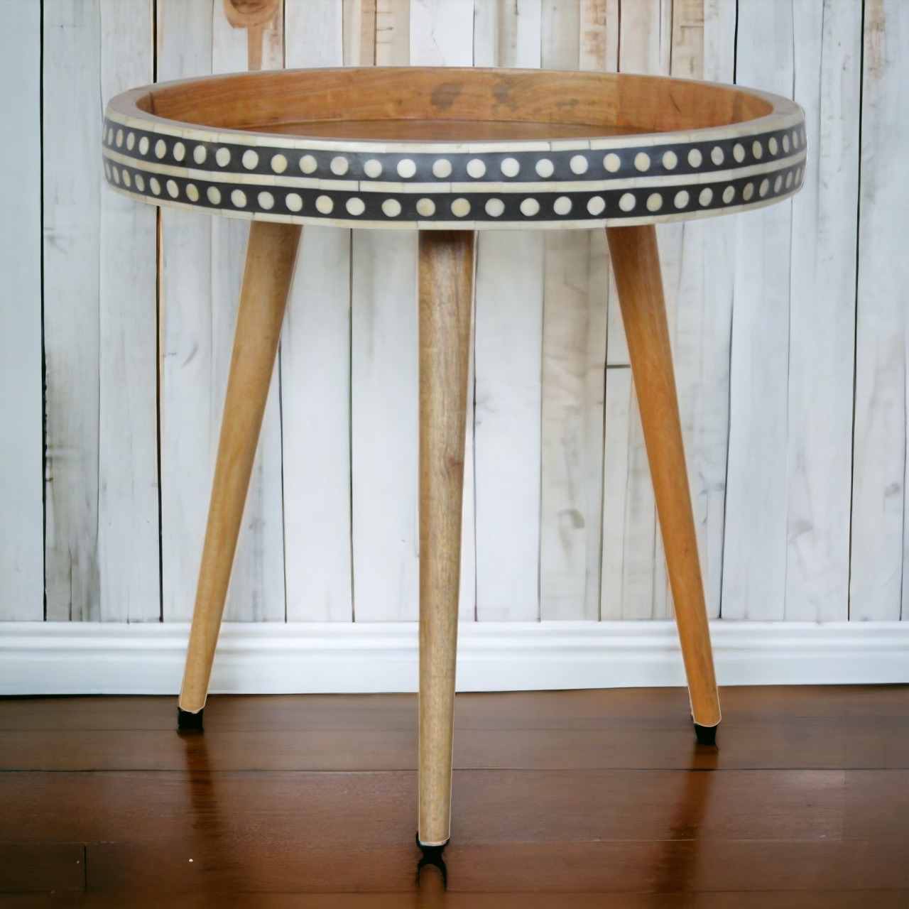 This solid wood end table has made from 100% mango wood in a fine oak-ish finish. The no-fuss finish reveals the beautiful grain of the mango wood which this piece of furniture is made of. This tripod table stands on Nordic style legs and features a black and white bone inlay pattern on the edges. The bone is sourced responsibly from deceased animals such as camels, goats, and buffaloes.