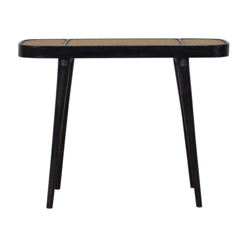 This console table has been beautifully made from 100% solid mango wood in a ash black finish with a hand-woven rattan top. Featuring rounded corners, the console table can be used in a variety of settings such as the bedroom, hallway or living room. Perfect for storing pieces like flowers, photo frames etc.