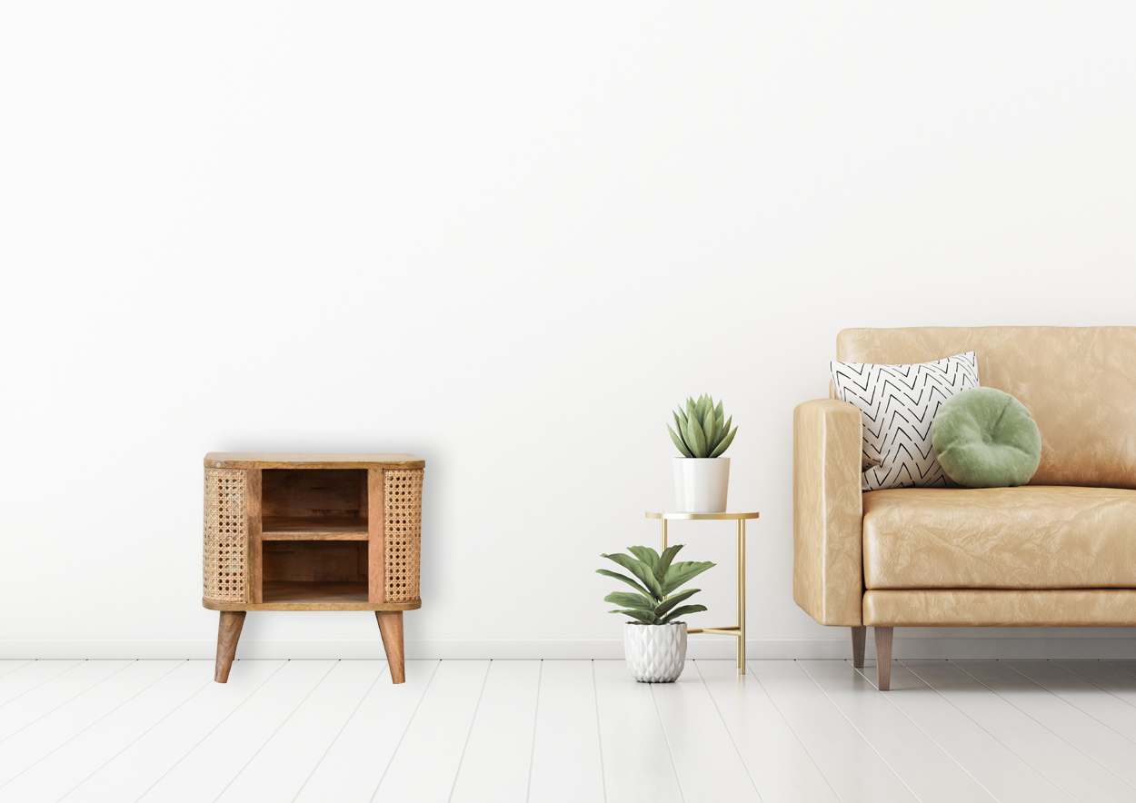The Larissa nightstand will stand out in your interior thanks to its understated look and subtle originality. The beautiful grain pattern and rattan design do not make this sideboard any less functional. In fact, it features 2 mini drawers and ample space on top for a lamp, plant or candle. It has been constructed from 100% solid mango wood in an oak-ish finish and features nordic style legs.
