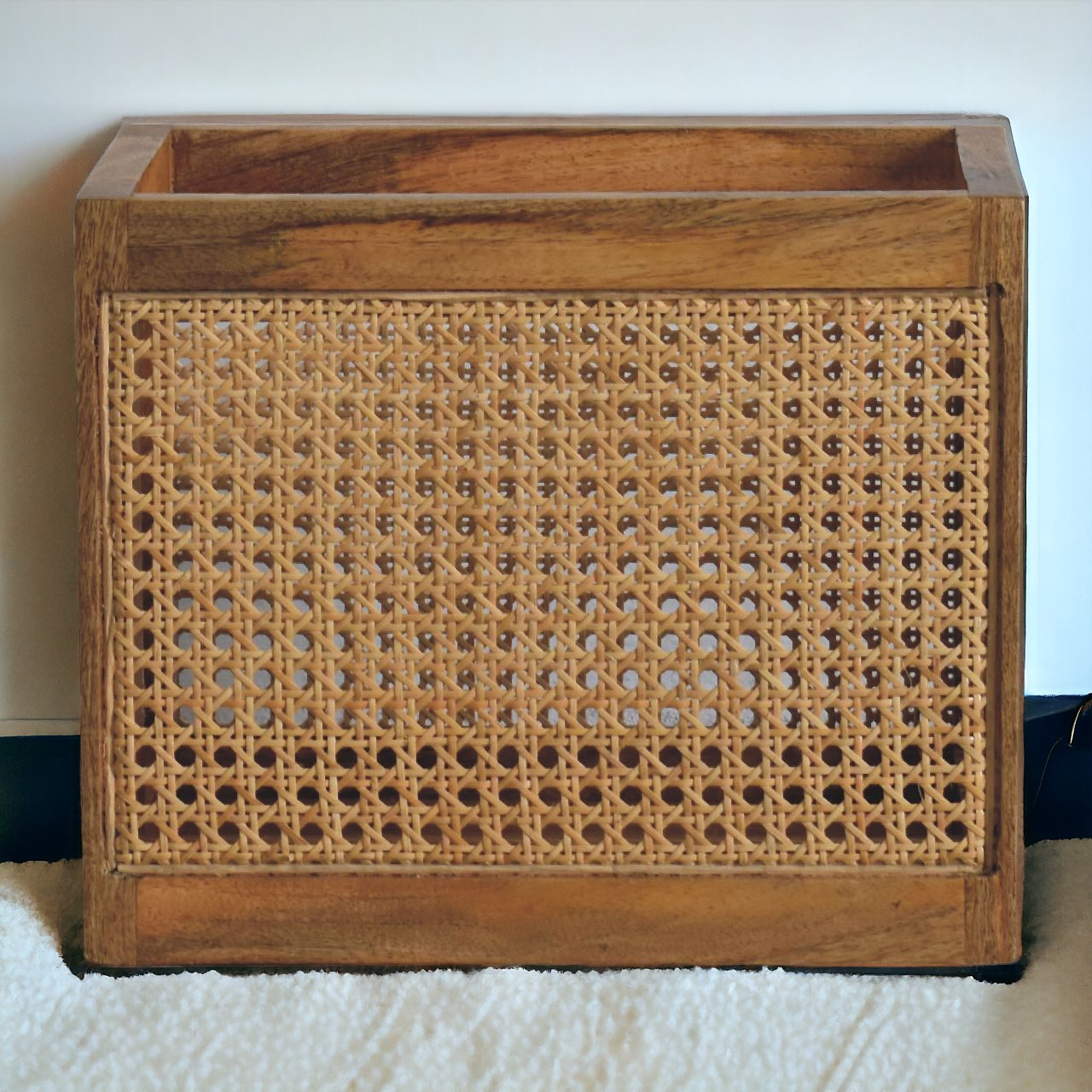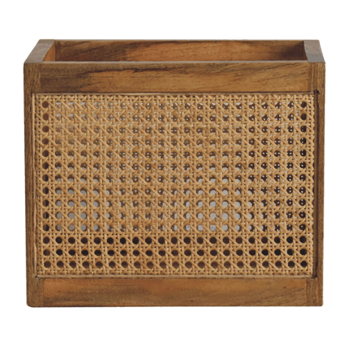 This stylish Rattan Storage Basket combines a rattan front with a smooth oak-ish finish body. Constructed from 100% solid mango wood, it is a handy piece for storing everyday utility items, meaning it will come in handy in the bathroom or bedroom.