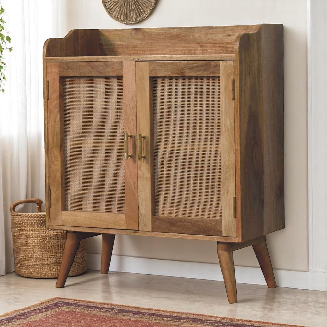 This beautiful T-bar Cabinet has been constructed from 100% solid mango wood and has a lovely natural oak-ish finish. It features a clean rattan design on the doors, t-bar handles, as well as 4 Nordic style legs for stability and a modern touch. Make full use of this piece in your living room or hallway and let it take care of storing all your belongings.