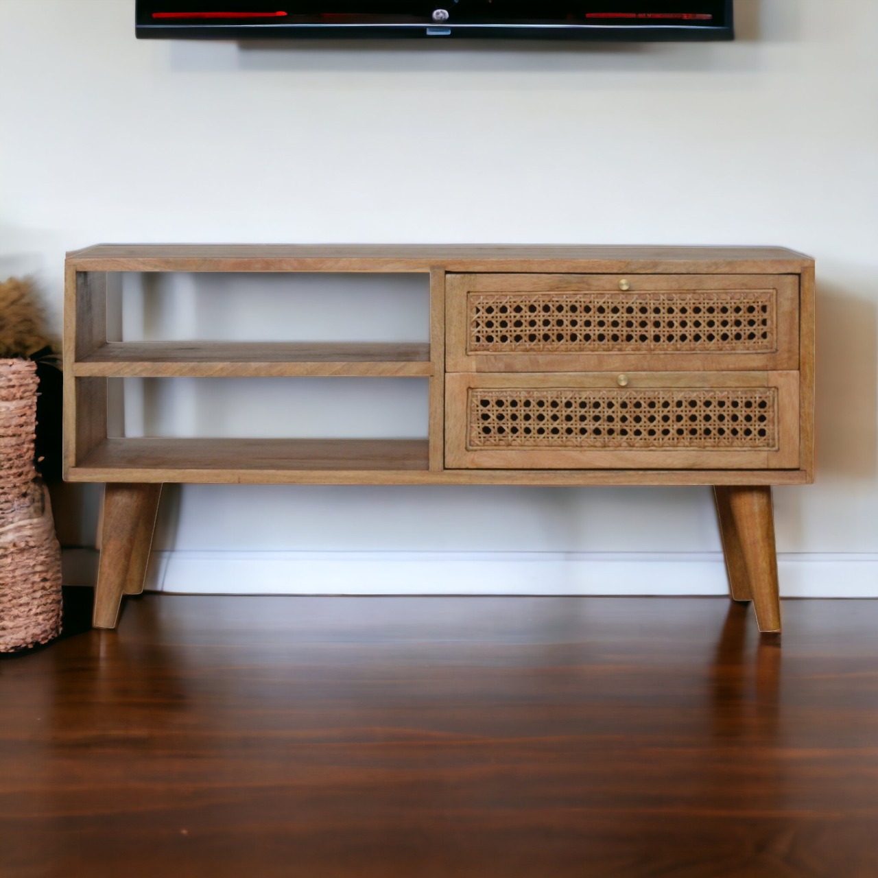 This media unit has been constructed from 100% solid wood and has a lovely oak-ish finish meaning it can compliment many different styles of furniture and fit into a variety of interiors. It provides storage space with 2 rattan front drawers and 2 open slots. Perfect addition to the living room.