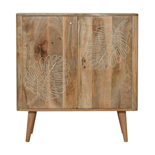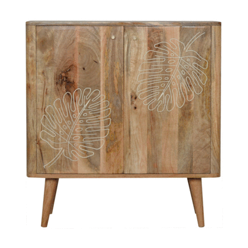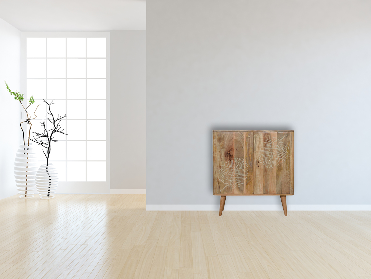 This cabinet has been constructed from 100% solid mango wood and finished in a fine oak-ish finish body. The main feature of this piece is the resin leaf embossing detail on the door fronts giving the piece extra dimension and character and allowing you to store any bits and pieces discreetly. It also has 4 Nordic style legs and ample space on top for a lamp, photo frames or ornaments.