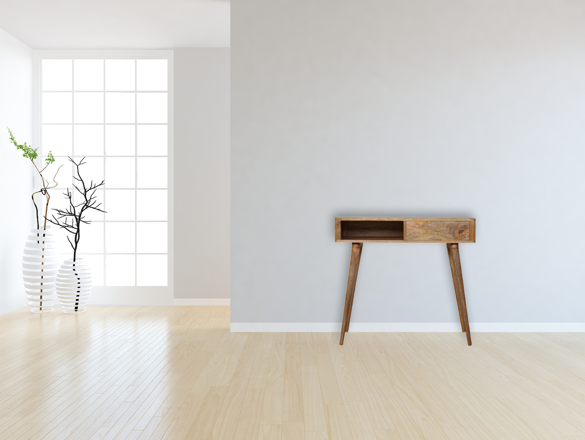 This writing desk has been constructed from 100% solid mango wood and finished in a fine oak-ish finish body. The main feature of this piece is the resin leaf embossing detail on top of the piece giving it extra dimension and character and allowing you to store any bits and pieces discreetly. It also has 4 Nordic style legs and ample space on top for a lamp, photo frames or ornaments.