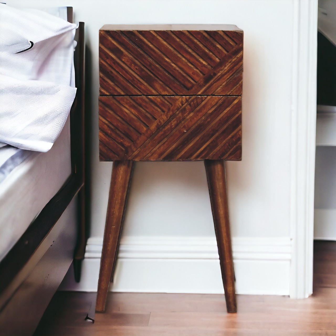 Add this mini unique solid wood Lille nightstand to your bedroom, constructed from 100% solid mango wood in a chestnut finish, this piece features a very unique line hand-carved design on the drawer fronts with a clean finish meaning easy access into the drawers without any knobs. It features 4 Nordic style legs which complement the body nicely and gives the entire piece a contemporary look. The perfect addition to the home. This petite product is a part of Recession Collection.