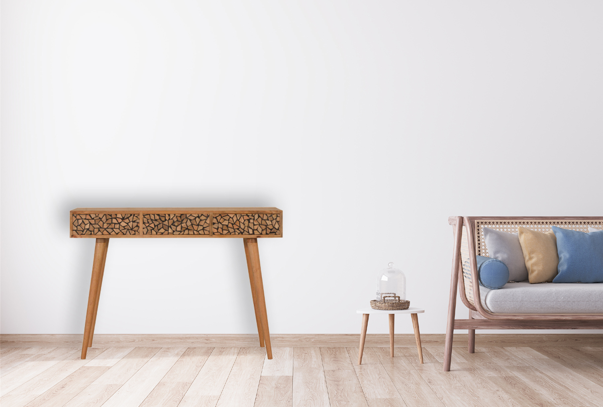 This console table has been constructed from 100% solid mango wood in an oak-ish finish. It has 3 Wood Resin Inlay drawers for storage convenience and features Nordic style legs with shiny knobs which give a lovely contrast against the print. More items are available from the Lisbon range.