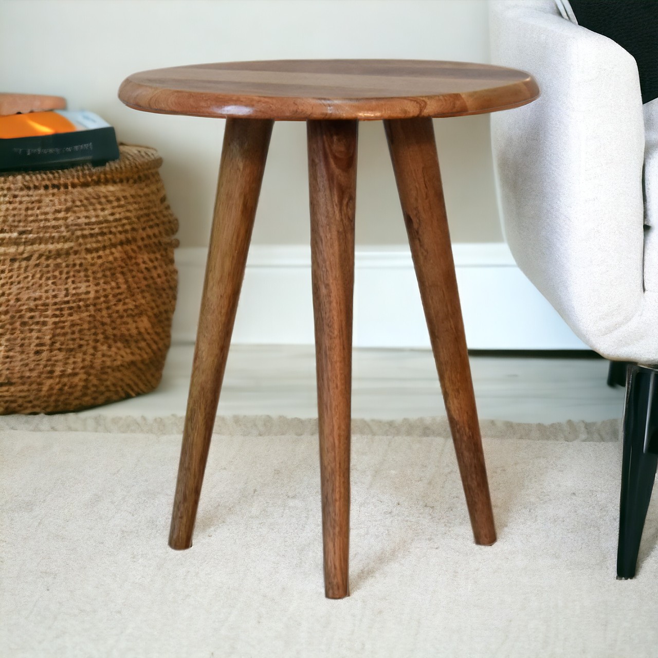 A traditional solid Nordic wood style round stool, made from 100% mango wood with an oak-ish finish. The no fuss finish reveals the beautiful grain of the mango wood. This tripod table has 3 Scandinavian style legs and is a versatile piece which can be used as an end table, lamp table or a stool which can be easily stored away in the home. Every piece of furniture is individually handcrafted and includes swing care tickets explaining the cautions and aftercare instructions.