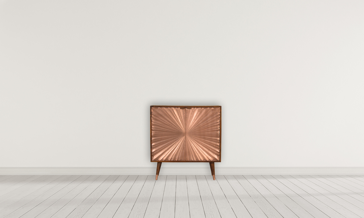 This Manila Copper Chestnut Cabinet was designed to add a touch of elegance and charm to your home. It features copper-inlay plated doors and Nordic-style cap feet, this piece has been constructed from 100% solid mango wood and offers a rich chestnut finish along with pull-out handles and surface space on top to uplift your living room or hallway.