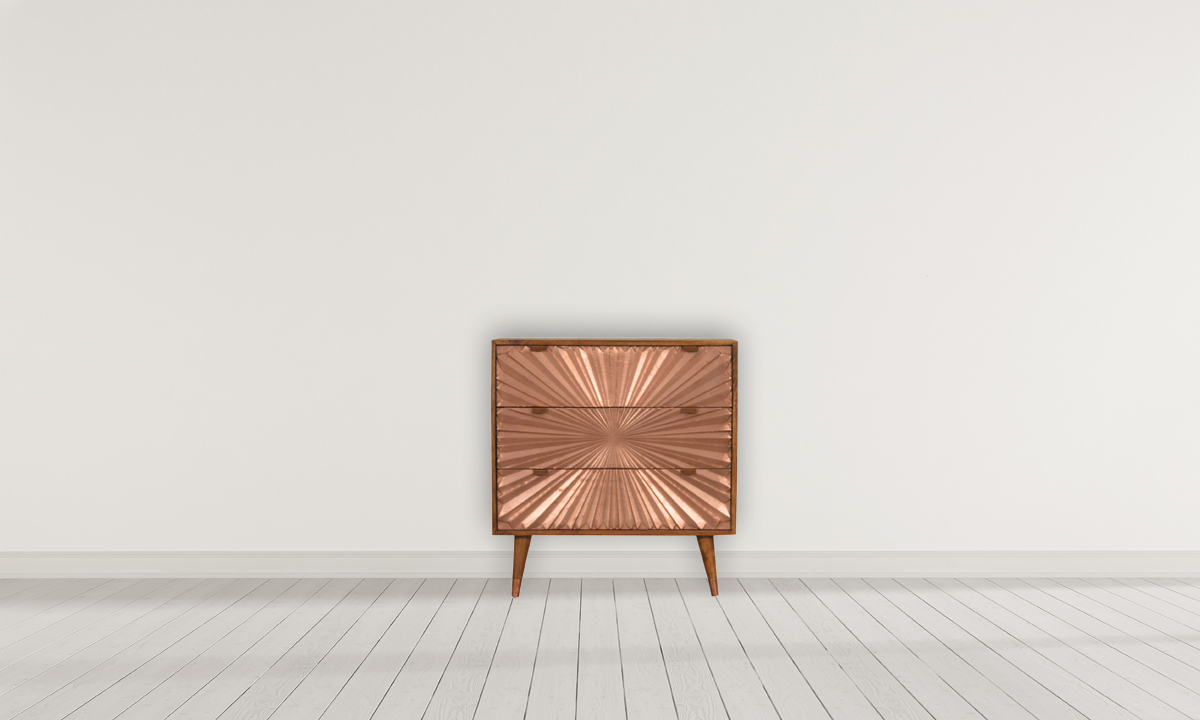 This Manila Copper Chestnut Chest was designed to add a touch of elegance and charm to your home. It features 3 copper-inlay plated drawers along with Nordic-style cap feet, it has been constructed from 100% solid mango wood and offers a rich chestnut finish, as well as pull-out, handles, and surface space on top to uplift your bedroom.
