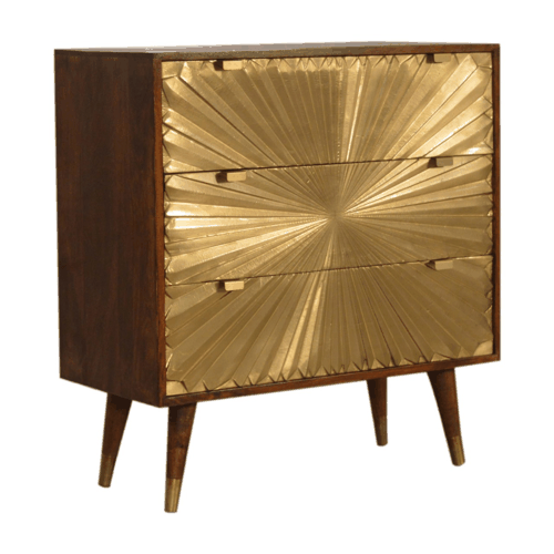 This Manila Chest was designed to add a touch of elegance and charm to your home. It features 3 brass plated drawers along with Nordic-style brass cap feet, it has been constructed from 100% solid mango wood and offers a rich chestnut finish, finally, pull-out handles are provided for easy access into the drawers along with surface space on top to uplift your bedroom.