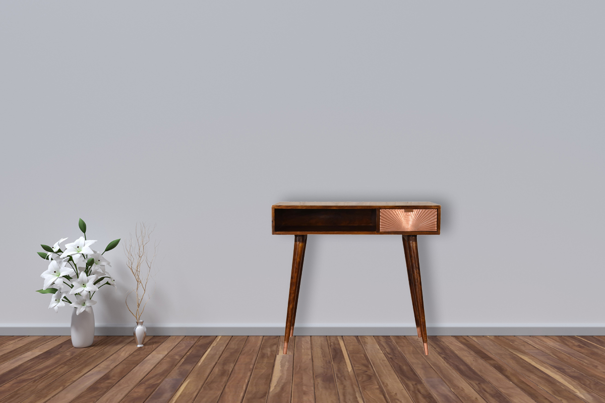 This Manila Rose Gold Writing Desk was designed to add a touch of elegance and drama to your home. It features a copper plated drawer and copper cap feet which blend beautifully with the chestnut wood finish along with a large open slot perfect for storing papers and documents. This writing desk will surely uplift your bedroom, living room or study.