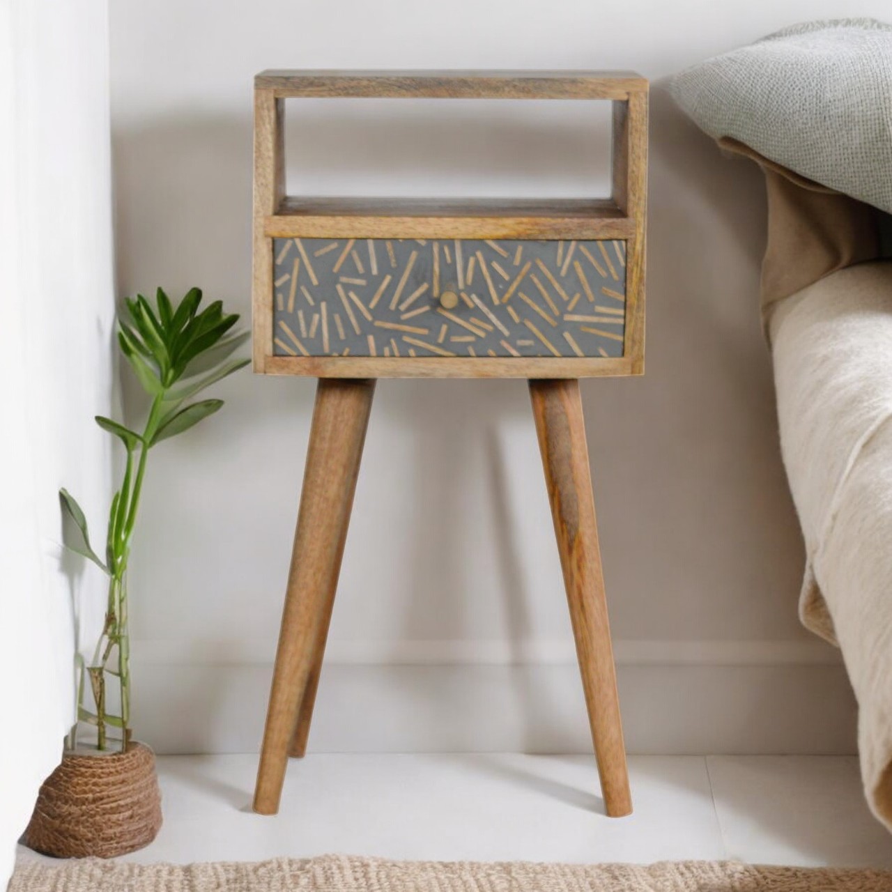 This beautifully designed nightstand is constructed from 100% solid mango wood and has a oak-ish finish. Useful storage space is available with 1 drawer with a cement finish with a wood chip design, 1 shelf and a decent sized table top to place any ornaments. Other features include 4 Nordic wood style legs. This is a modern style which will suit most homes.