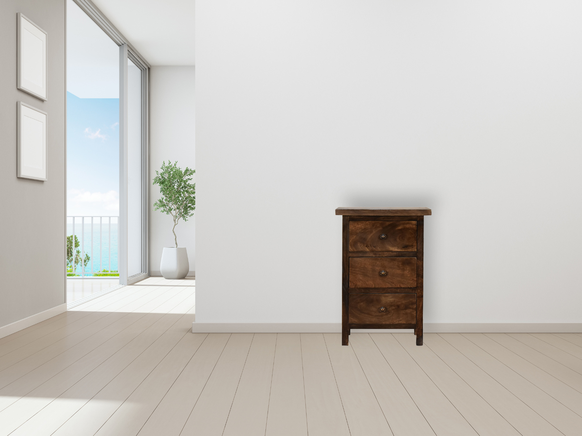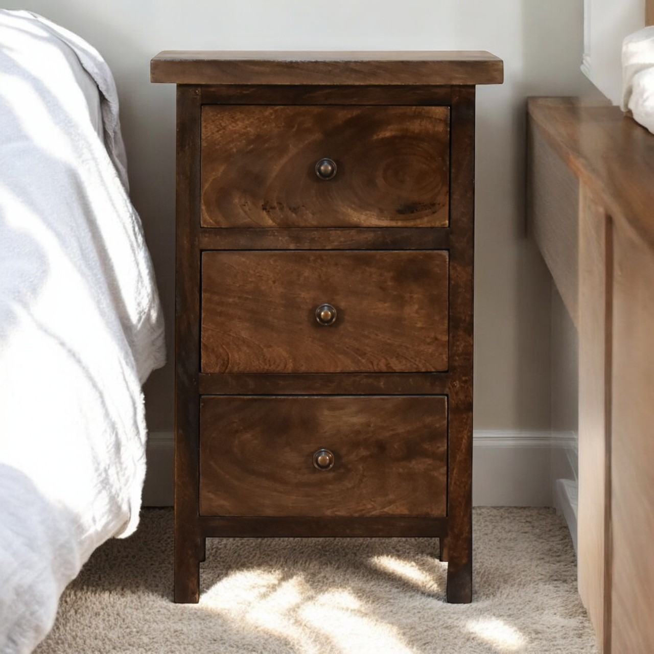 Standing by your bed, this nightstand gives you easy and convenient storage books, a glass of water or a phone. This three-drawer nightstand will add warmth and character to your space. Beautifully made from 100% solid mango wood with a fine classic grey finish; its clean and elegant lines give a timeless appearance. Other features include 3 drawers, straight farm house feet and shiny round knobs.