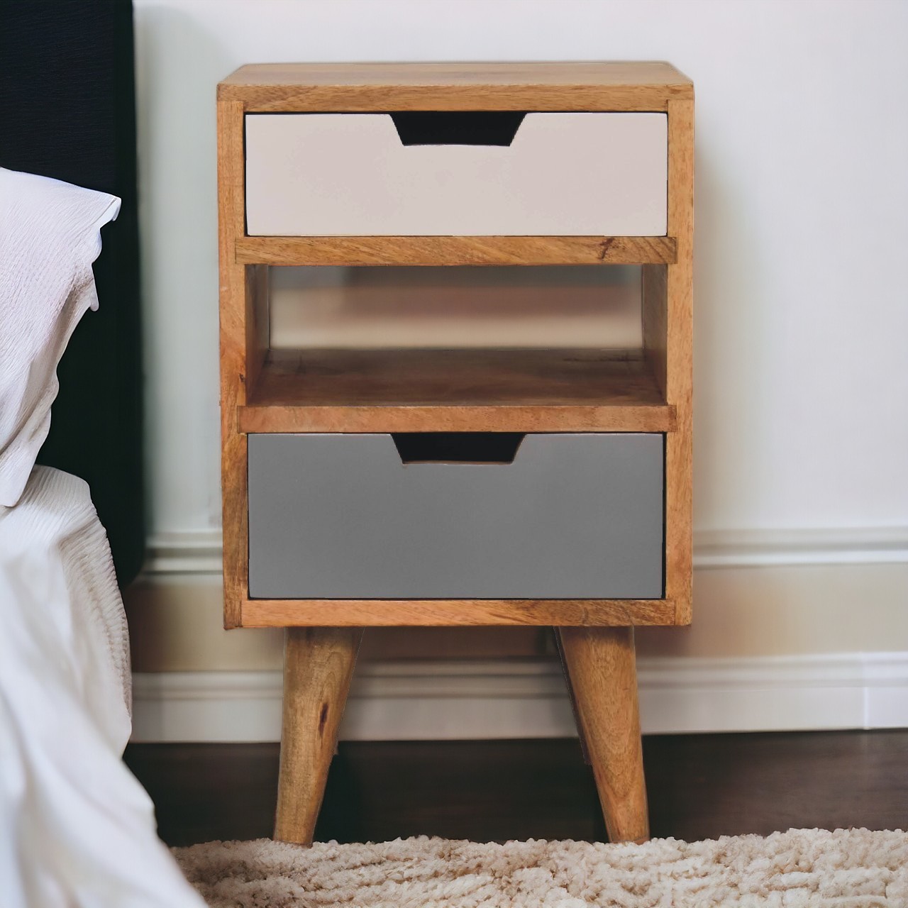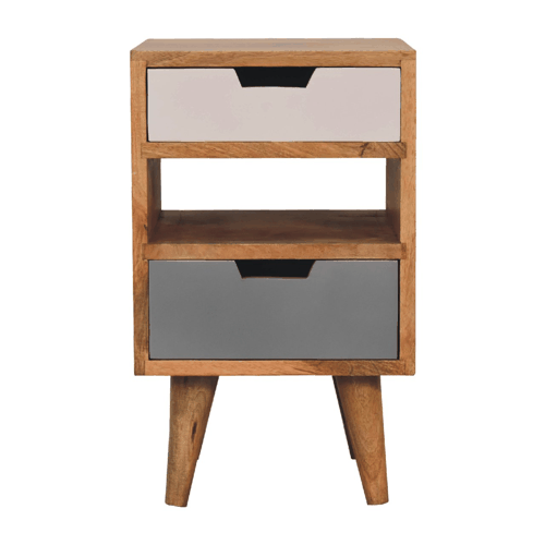 This mini white and grey gradient nightstand has been constructed from 100% solid mango wood in an oak-ish finish and would be a perfect companion beside any bed, it stands on 4 Nordic-style legs and features 2 hand-painted grey and white handy drawers and 1 shelf in the middle. It can be partnered up with the other products from the range or stand-alone. A perfect addition to any home. This product is part of the Recession Collection.