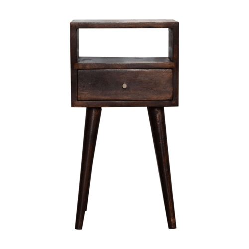 This beautifully designed nightstand is constructed from 100% solid mango wood and has a rich light walnut finish. Useful storage space is available with a 1 drawer, 1 shelf and a decent sized table top to place any ornaments. Other features include a pull out drawer, and 4 Scandinavian styled legs to give it that Nordic/modern style which will suit most interiors.