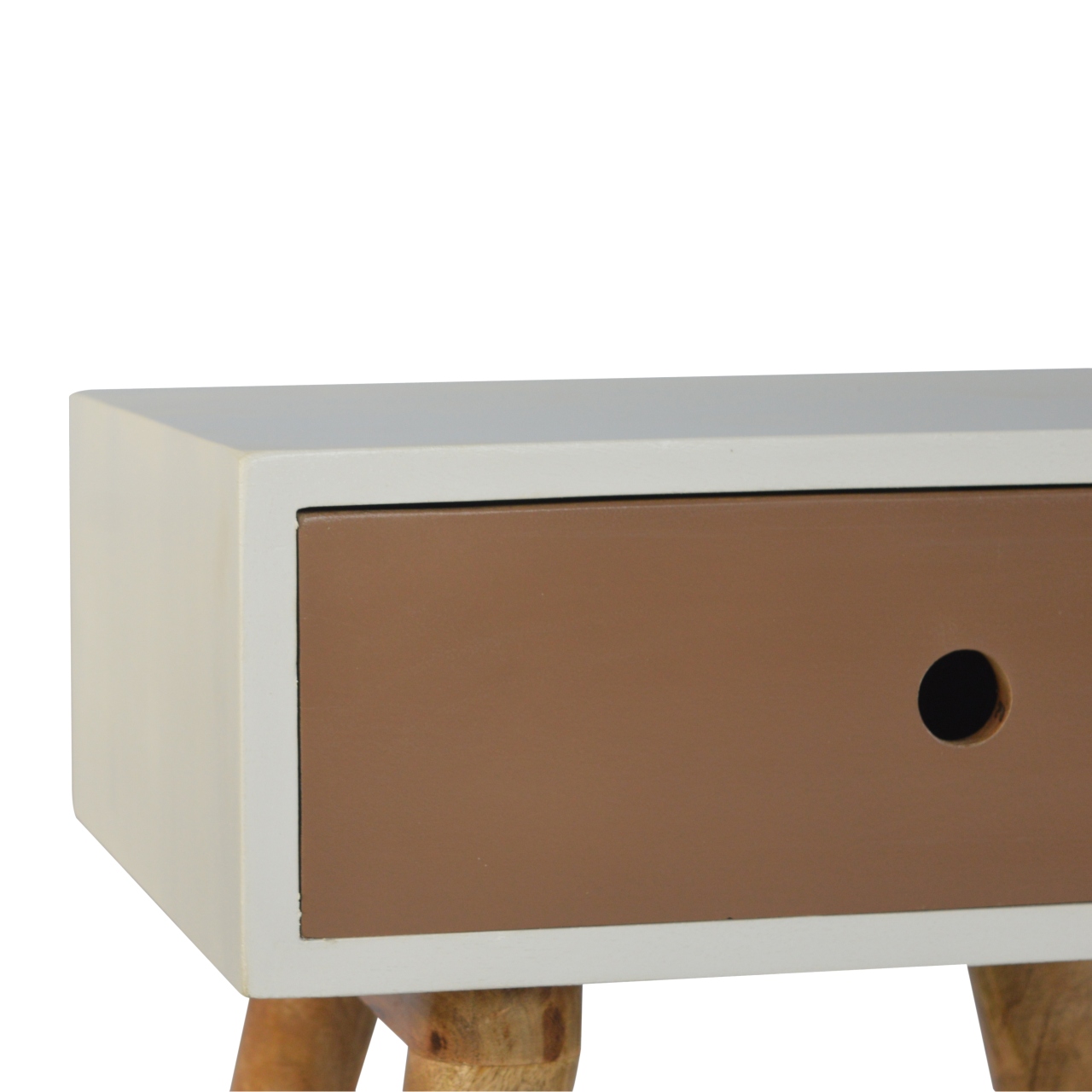 This beautifully designed nightstand is constructed from 100% solid mango wood and has been hand painted white with a mocha brown painted drawer which has a round cut-out for easy access. It also features 4 Oak-ish finish Nordic style legs which compliment the top perfectly. A lovely addition and accent piece for the home.