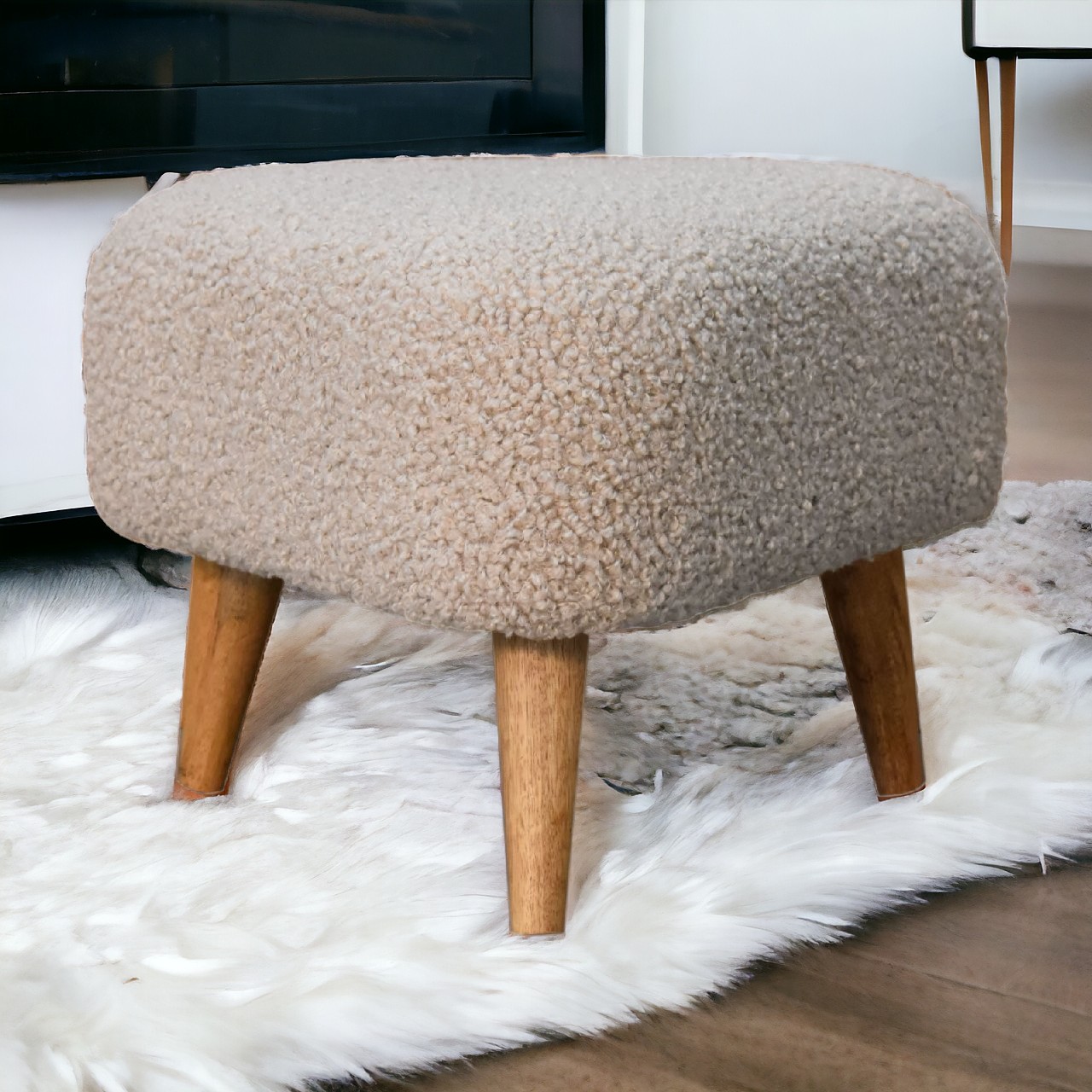 This sophisticated footstool has been upholstered in our new mud boucle fabric which will prove classy in your home. It poses a triangular shaped seat and stands on 4 nordic style legs which have been constructed from 100% solid mango wood in a oak-ish finish.