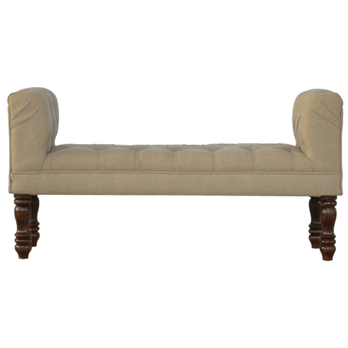 Update your home decor with this lovely mud linen upholstered bench constructed from 100% solid mango wood. It is the perfect piece of furniture for a bedroom or living area, and this bench is ideal for extra seating. Other features include hand turned legs that have a fine light walnut finish, deep buttoned upholstered top and sheltering arms.