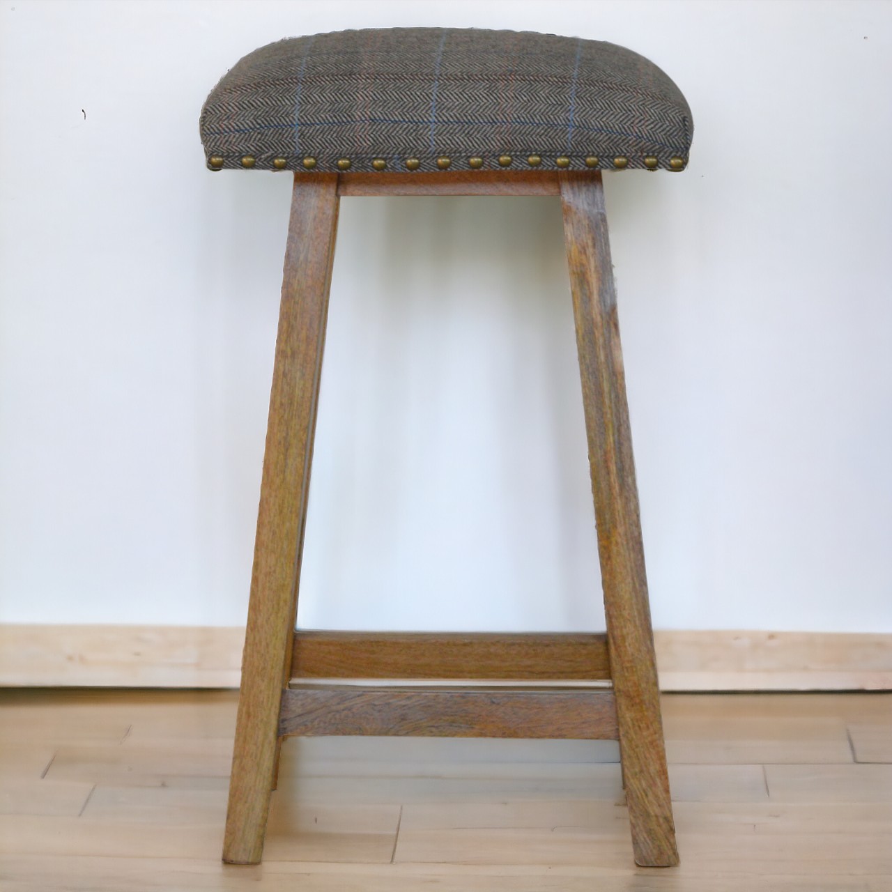 A very strong and compact Nordic tweed bar stool; popular for use in kitchens, bars and cafes. These wooden stools are ideal for a kitchen stool in a breakfast bar type eating area. They are very strong yet light enough to move around easily. This piece of furniture has a smooth oak-ish finish and is made of 100% solid mango wood, with a beautiful multi tweed cushion on top. You may encounter variations from batch to batch if you are looking to pair products under similar room settings; you can opt for a bespoke order or take an informed decision about the possible variations.