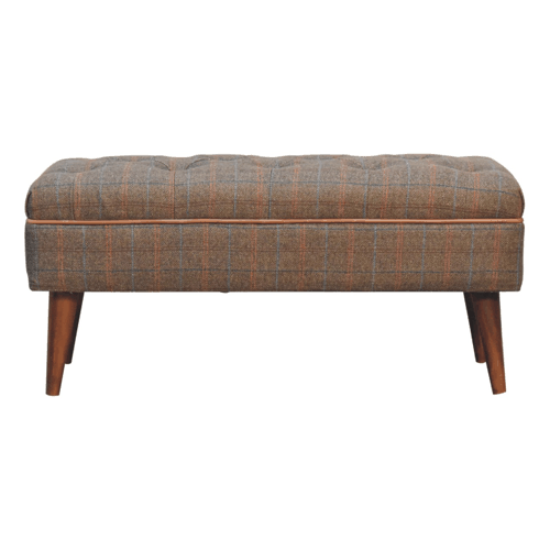 This chic bench has been upholstered in multi-tweed tweed and features a stylish deep button design on top for comfort and design. The legs have been constructed from 100% solid mango wood in a chestnut finish which compliments the fabric beautifully and the leather piping adds extra effect to the piece.
